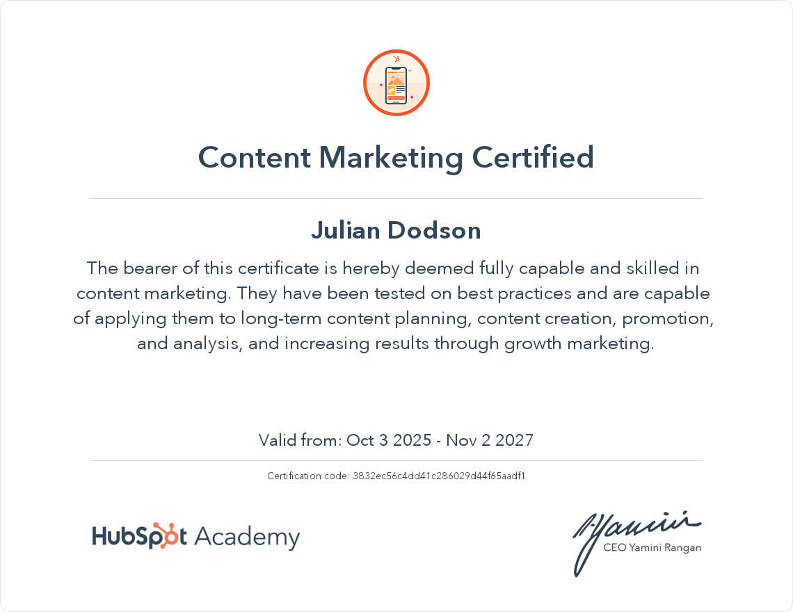 I currently have my Content Marketing Certification from HubSpot Academy, Graphic Design Technician Certification from Yavapai College, Associates Degree in General Education from Yavapai College, and my ACP (ADOBE CERTIFIED PROFESSIONAL) certifications from ADOBE in Photoshop and Illustrator.