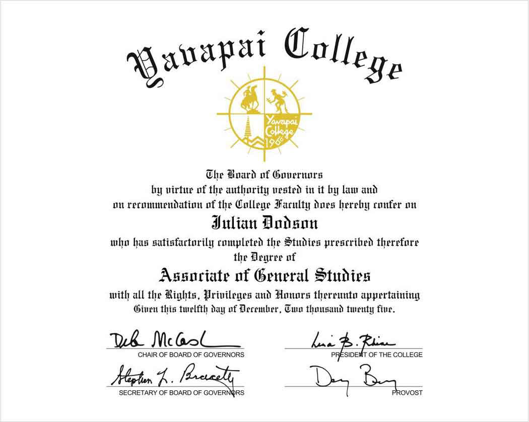 I will be completing my Bachelors degree in Business with a concentration of Entrepreneurship from Yavapai College in December 2026.